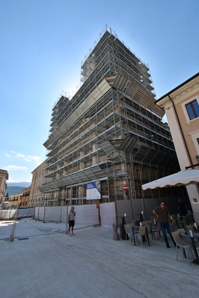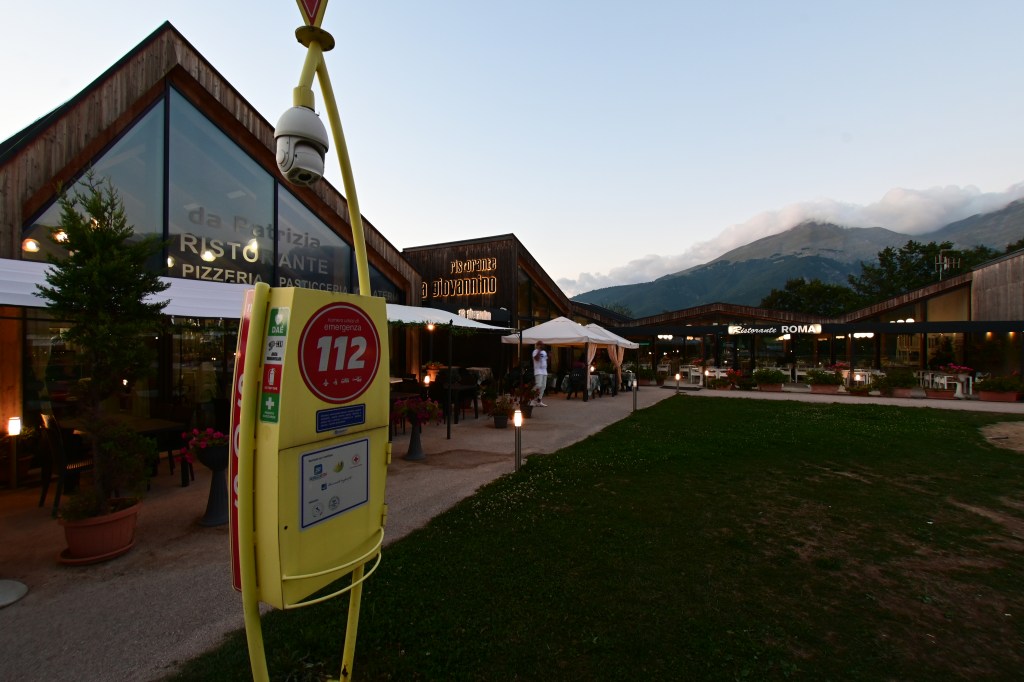 Per rispetto non ho voluto fotografare le unità abitative, ma la zona commerciale nuova, sulla spianata, ospita le varie attività. Curiosa, e al tempo stesso commovente, la zona dei ristoranti, ricostruiti tutti con la stessa impronta, insieme, affiancati l’uno all’altro. Giusto, sbagliato, un surrogato? Ripeto: non giudico, ma che ammiro il coraggio mi sento di dirlo.