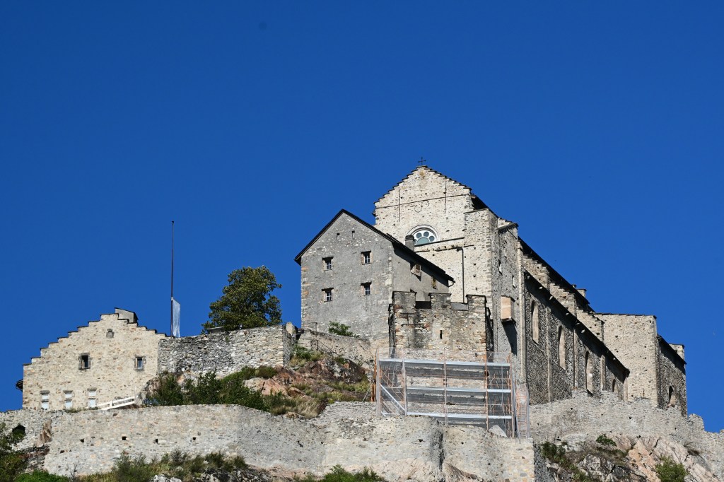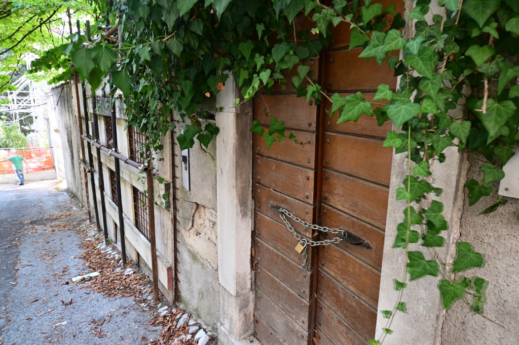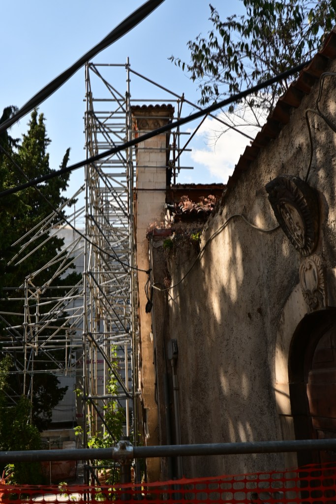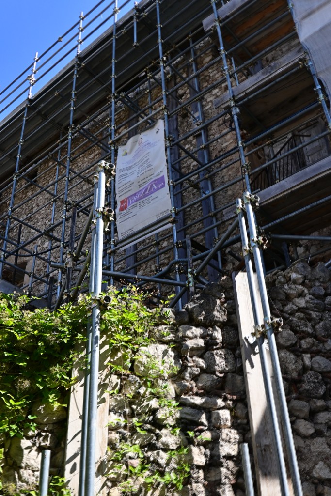 Le impalcature, gli esoscheletri delle costruzioni che probabilmente non verranno mai rimosse, chissà, alternano cartelli a segnalare una ditta appaltatrice, ma anche lucchetti, delimitanti qualcosa che non viene aperto da chissà quanto.